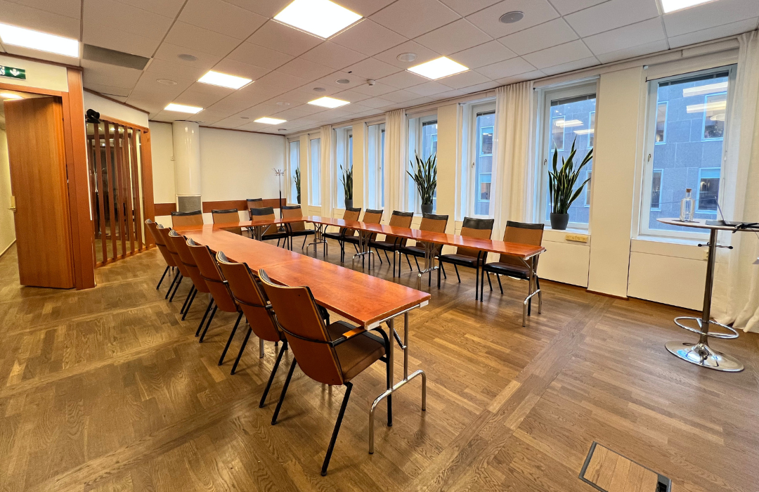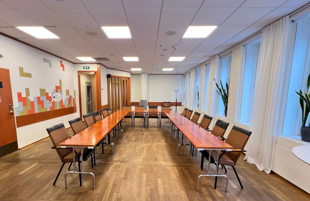 I taket finns takhögtalare och takmikrofoner för bra ljudupptagning från deltagarna i rummet. Utbildningssalen lämpar sig väl för hybridmöten.