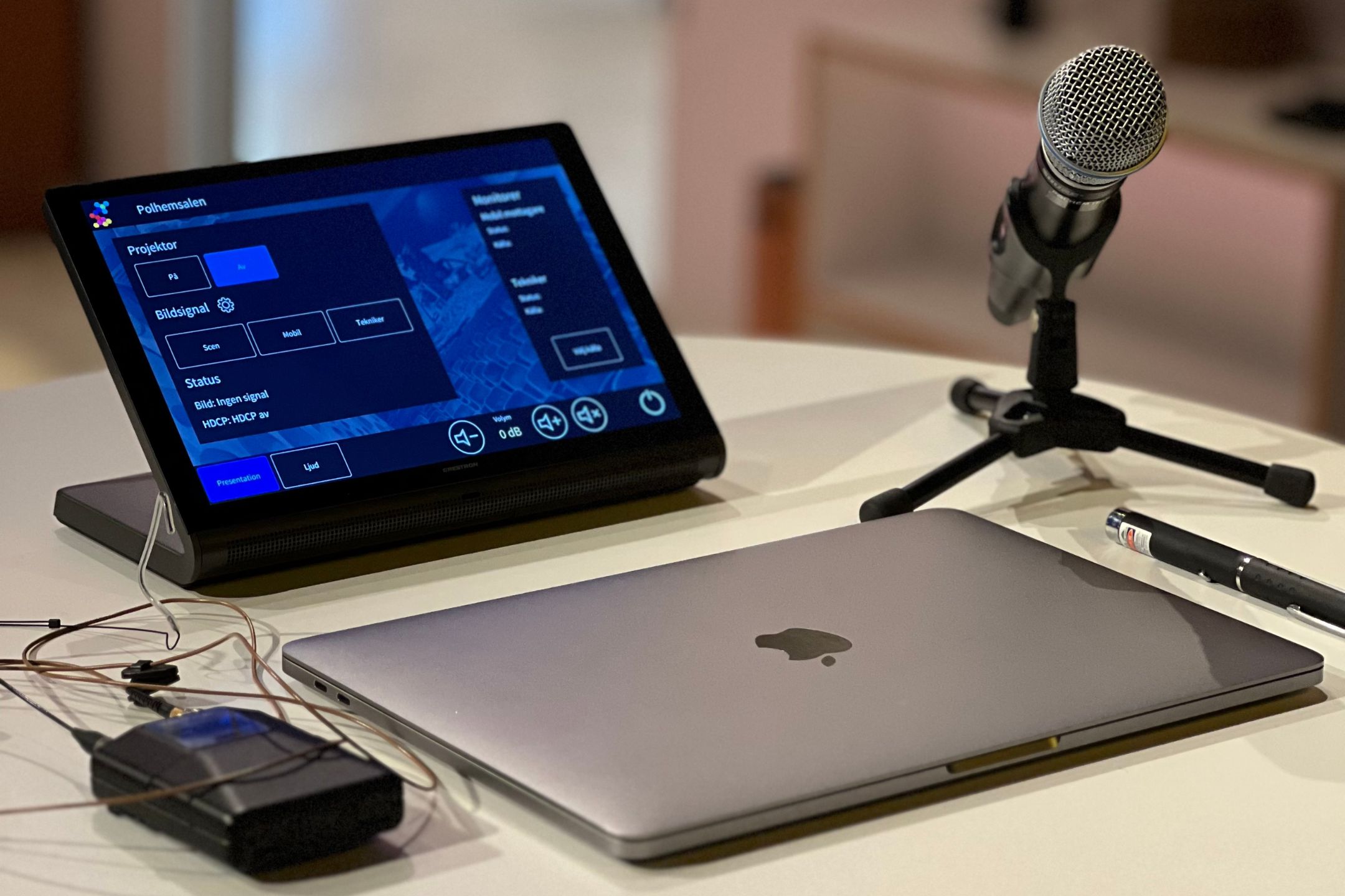 Hörsalen är väl förberedd för digitala möten och webbsändningar. Belysningen i lokalen är också anpassningsbar efter era önskemål.