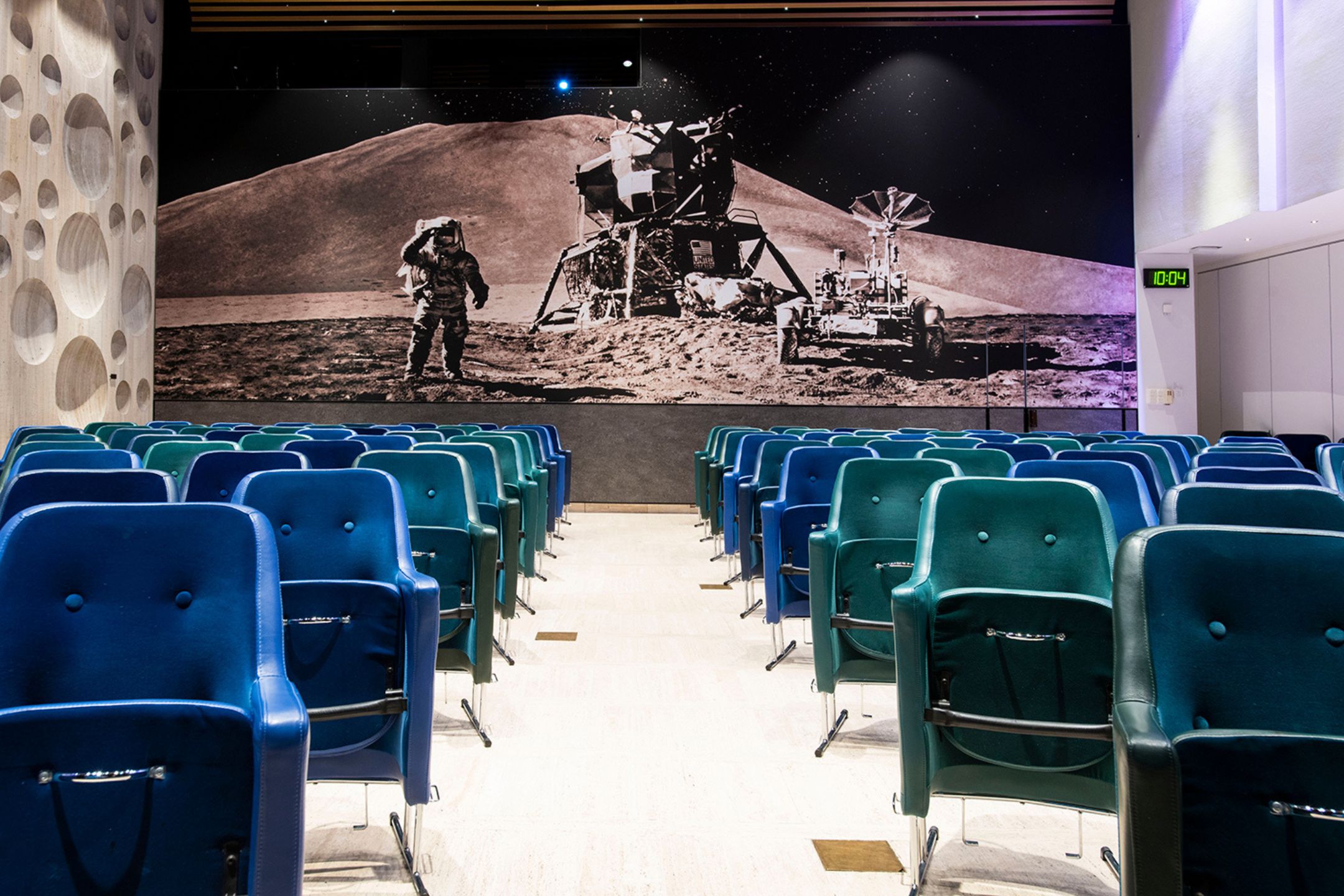 Polhemssalen är mer än bara ett mötesrum – det är en resa genom rymden. Med sina stenväggar skapar det en känsla av att vandra genom en krater, medan den mjuka belysningen ger ett svagt sken av stjärnor som lyser upp rummet.