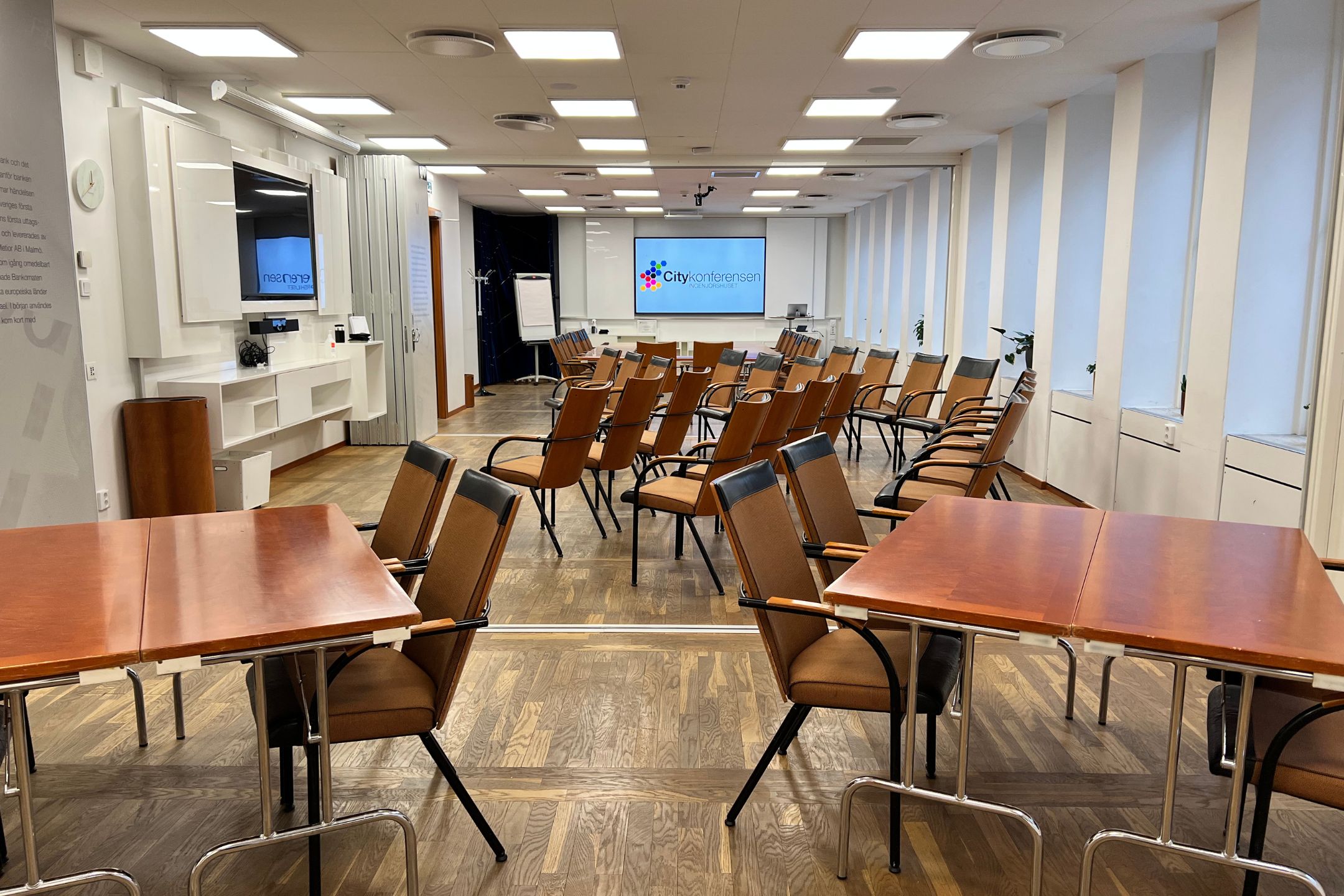 Eftersom lokalen inte har någon fastmöblering kan den anpassar precis efter era önskemål. Även det här konferensrummet har ljusterapilampor i taket som hjälper till att hålla fyllda med energi. Det kraftiga ekgolvet gör att störande ljud från stolar som flyttas och saker som tappas knapps hörs. Den här konferenslokalen har alla förutsättningar för en lyckad konferens.
