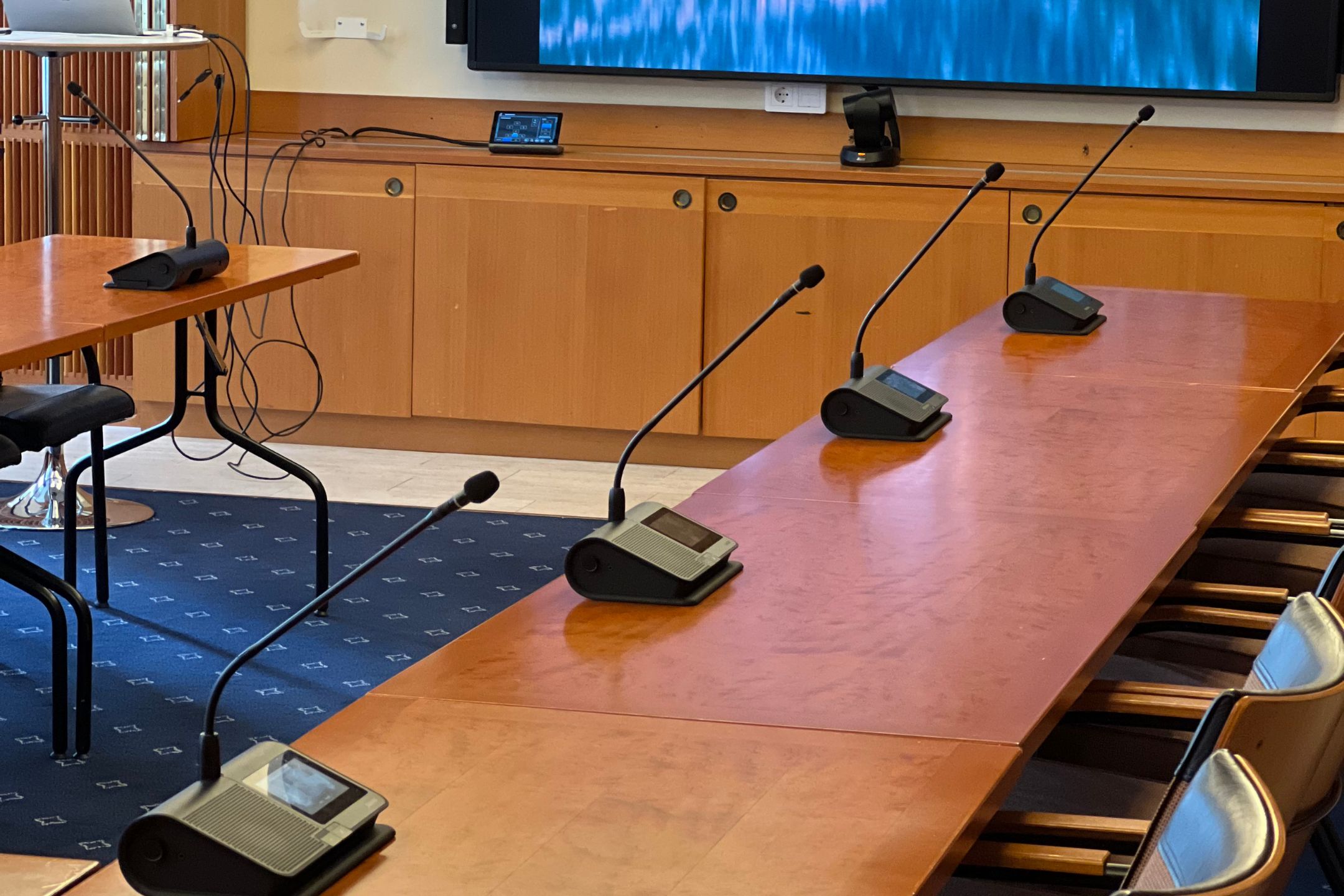 Ni ansluter lätt till skärmen och ljudsystemet genom egen dator. Här finns även ett delegatsystem installerat så att alla runt bordet både hörs och hör bra under mötet.